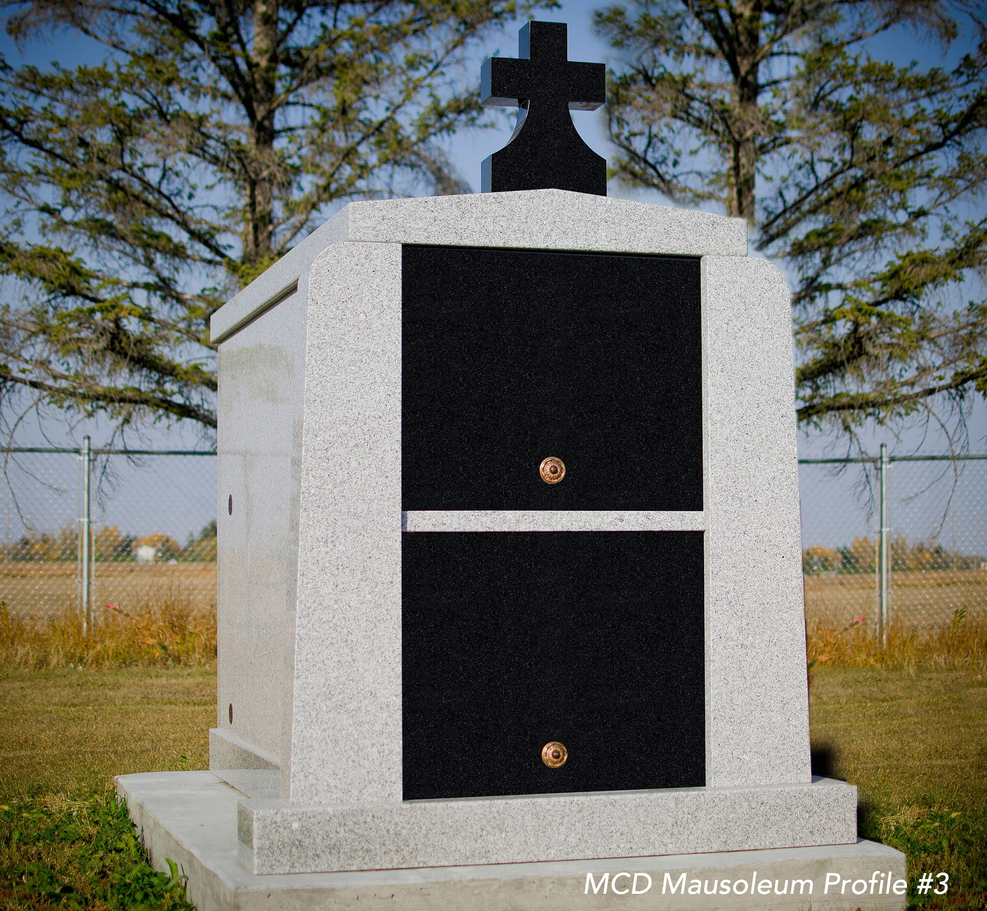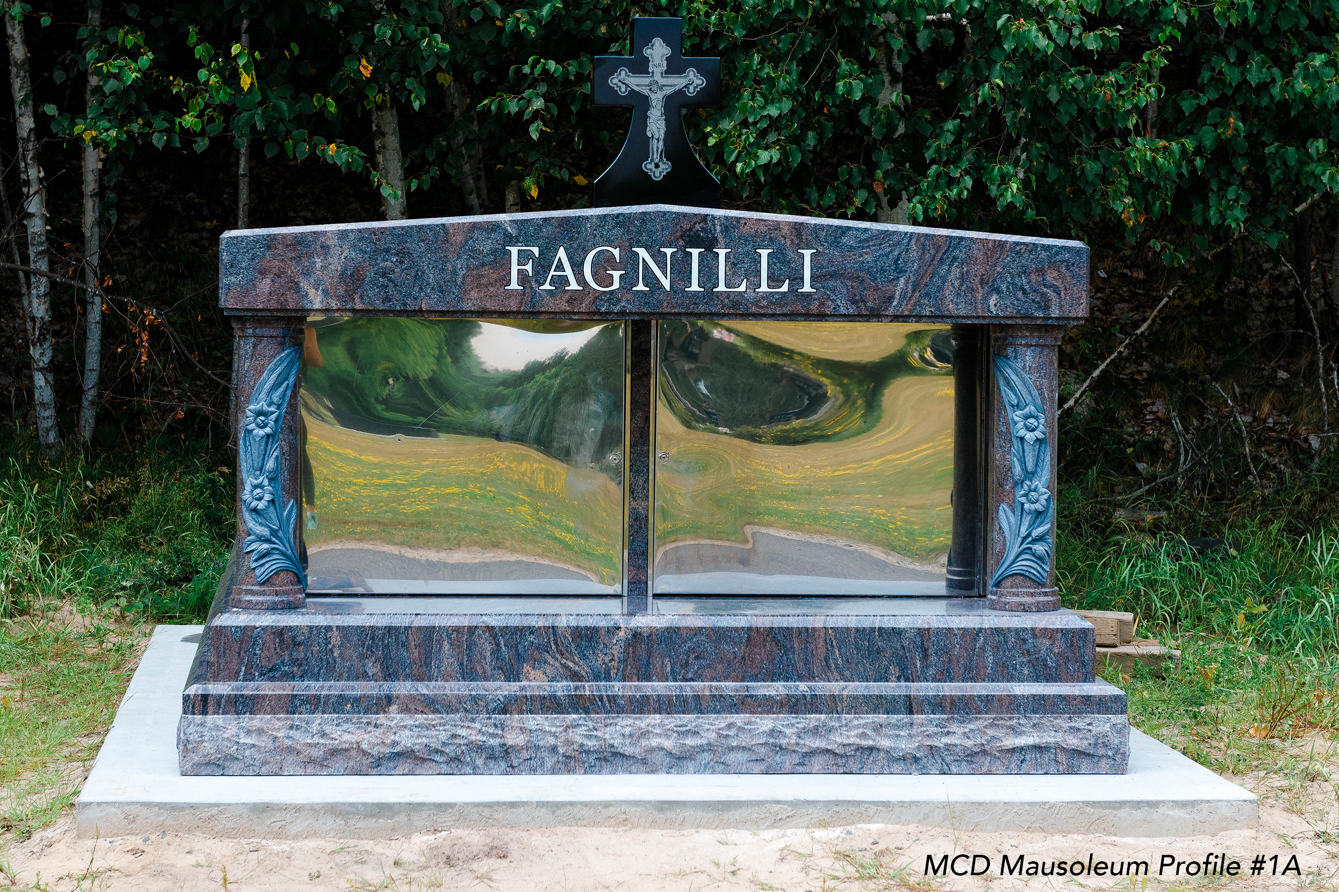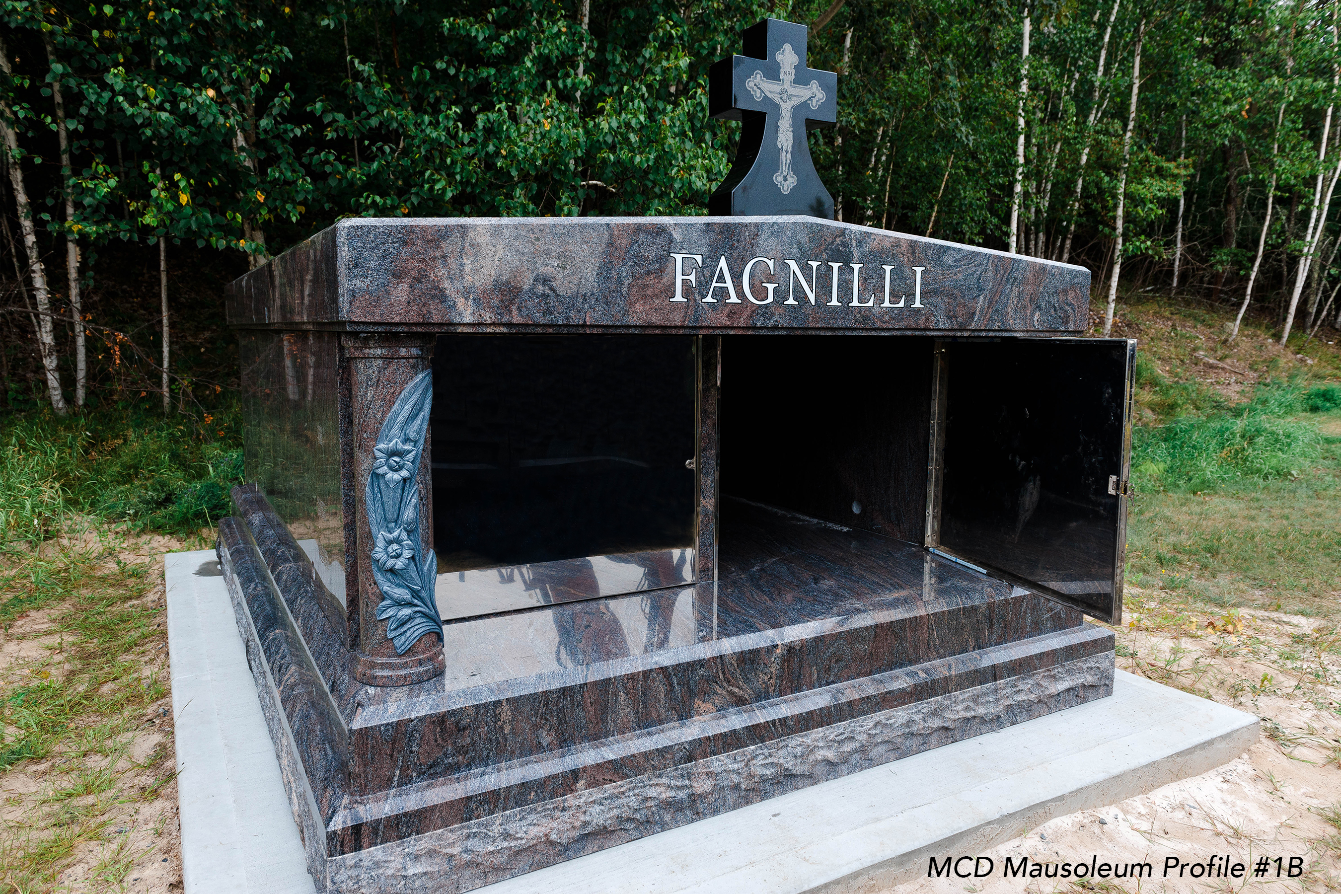 All our mausoleums are constructed of all granite with a dividing privacy granite wall between the two crypts as well as stainless steel security doors on each crypt ensuring never having to see the coffin upon the second interment. We provide two, four, six crypt mausoleums in all our colors listed. We offer different styles from plain to custom.
